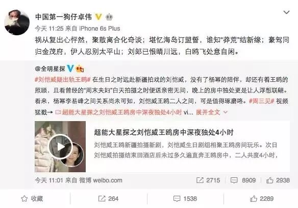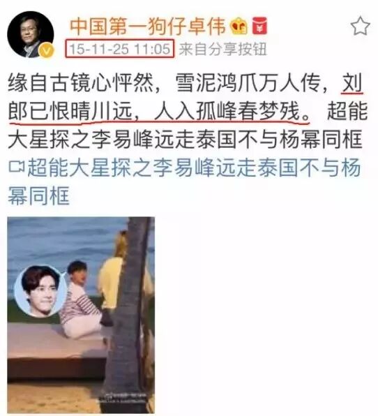 就在大家都开始淡忘这条新闻的时候,当时风头正劲儿的内地狗仔卓伟表示他不信。并以“刘郎已恨晴川远,一入孤峰春梦惨”来暗喻刘恺威杨幂与“孤(一)峰”李易峰三人的关系。