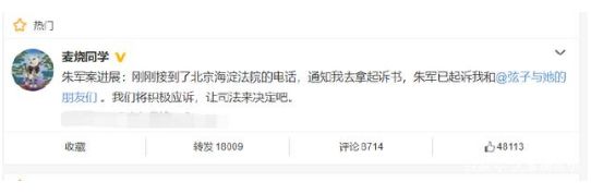 据当事人透露,朱军在9月19日开始以微博、弦子、麦烧三方对象发起了诉讼,他与代理律师提出四项诉讼请求,分别是删除弦子、麦烧的微博账号并披露相关博文数据,甚至还爆出了朱军和代理律师的要求分别是删除他们在平台上的新闻消息,以及弦子当事人和麦烧爆料人在报纸和微博上公开向朱军本人道歉还朱军本人一个清白,并赔偿朱军65万元人民币并承担本次诉讼费用。