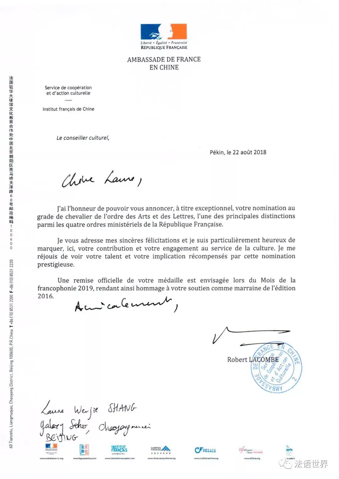 近日,法国驻华使馆发布消息: 鉴于尚雯婕女士在艺术领域的精深造诣与影响力,以及对中法文化交流传播事业所做的突出贡献,法国驻华大使馆正式授予尚雯婕文学与艺术骑士勋章( Chevalier de l'ordre des Arts et des Lettres)。”