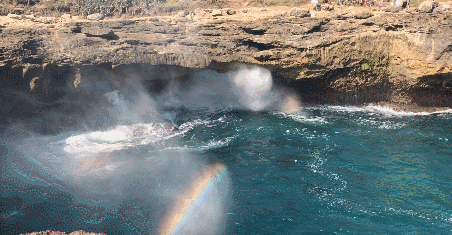 恶魔的眼泪,凶猛的海浪拍打在海湾的岩石上,激起一片白茫茫的雾气,在阳光的照耀下出现一道迷你的彩虹。海水顺着岩石流下来,在石缝中形成无数个微型瀑布。日积月累便形成了这样特殊的地形,远远望去仿佛是恶魔的脸上落下的,浪花特别壮观。