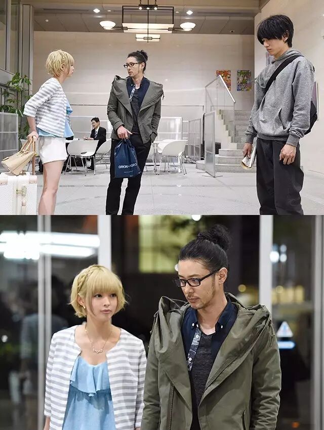 初登场就是穿着wjk的拼接衬衫,深蓝色当中可以看见迷彩的模样;另外同样是蓝色系带有点风云波浪以及另一幕的棕色拼接樱花图案口袋的长袖衬衫,这两件都是带有许多和风元素的品牌“衣樱”。