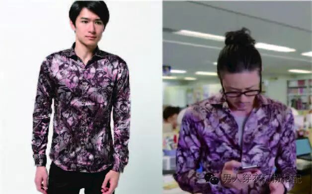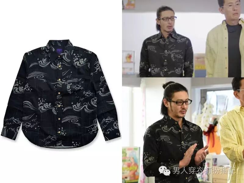 花俏光泽人造丝大印花的衬衫,是出自日本男装品牌“TORNADO MART”2016年春夏款式。这么骚气的图案都能驾驭得了,不得不佩服小田切让的气质!