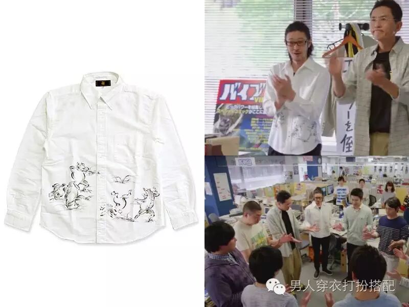 这件衬衫上有青蛙与猴子的手绘图,也是最有名的“鸟獣人物戯画”,这堪称“日本最早的漫画”充满着禅意也和这日剧主题有所关连,让人觉得讨喜。