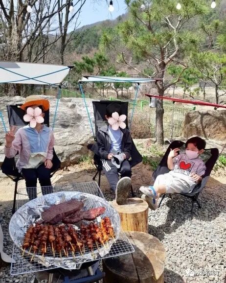 蔡琳为了让儿子能够吃好玩好,自己负责在一旁烤串,还有其他小朋友一起同行,民宇戴着口罩,胸前有一颗爱心,一个人躺在椅子上,妥妥的一枚潇洒可爱的小帅哥。