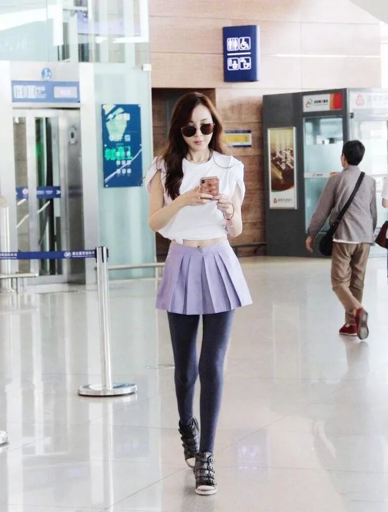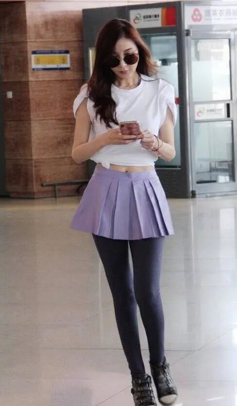 露手臂、露胸、露腰,要么露腿,最多露两个地方,露肤太多就会显得很俗气,有时会给人一种不端庄的轻挑感。萧蔷这一套造型,下身一条深灰色紧身打底裤+紫色百褶裙,捂得严严实实;上身一件白色短袖,将下摆在腰间系了个结,隐约露出了肚脐和性感的马甲线。不仅配色青春靓丽,适当的露肤也展示了其年轻优美的身材。