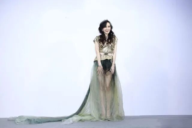 萧蔷上身一件金色亮面短袖,下搭一条牛仔热裤,外层配上长长的墨绿色拖地薄纱裙,戴着银色耀眼的钻石耳坠,看起来整个上半身都是BlingBling的,实现了真正意义上的“光彩照人”。下身的透视拖地长纱裙,若隐若现的展示出自己的一双逆天美腿,整套造型非常吸睛。