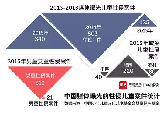 2016年,中国少年儿童文化艺术基金会女童保护基金发布的数据显示:该年公开报道的性侵儿童案件的778人中,男童遭遇性侵人数为59人,占比7.58%。