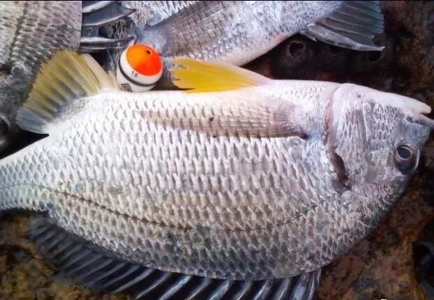 很快,阿波就有了动静,先没入水中,之后就停顿了,我提竿上来,勾上挂着一尾花鲷鱼,花鲷是俗名,学名叫大泷六线鱼,这种鱼在北方比较常见,山东钓友们常说的“黄鱼”就是这种鱼,这种鱼在浙江的背部沿海也能见到,但中南部沿海较少见到,这是一种底栖的鱼类,看来今天我设的钓棚还有商榷的地方。中午11点的时候,丫乌和阿汤用对讲机呼叫来了船再次换位,下船时,我看见他们每人都有三四尾大鲈鱼进账,提在手上沉甸甸的。