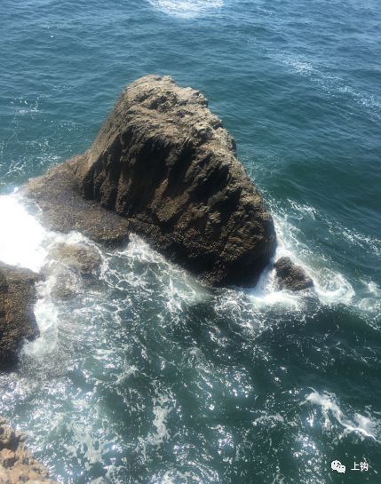 坚守了一段时间,我们三人都没钓到想要的鱼,对讲机一阵呼叫,其他人也都收获不好,于是决定集体换位。人员都到齐后,船接着往北开,到了北渔山海域。我终于看到了传说中的五虎礁,远远眺望,犹如一只只猛虎匍匐在无垠的波涛之间。丫乌和阿汤登上了五虎礁的虎头。船载着剩余的我们转个弯,拐到了鸡娘礁。过年前青松他们曾经来过渔山,就在鸡娘礁这一个不大的地方,钓获了几百斤的鲈鱼。于是决定下午再在这里试试运气。