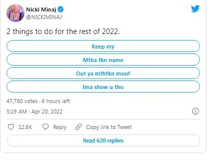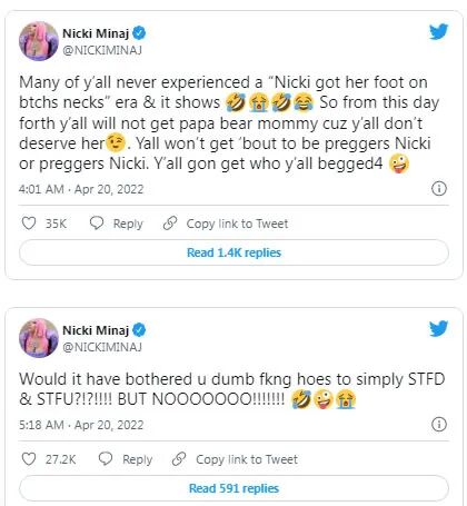 Nicki周二晚连发了数条推特,不指名道姓地给某些人发出警告。