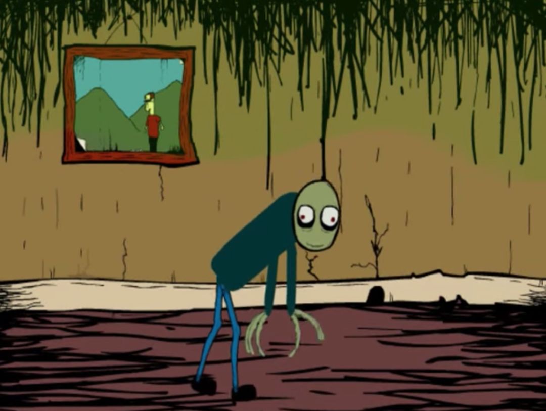 科普一下,《沙拉达手指》(Salad Fingers)是一部英国的 FLASH 动画。主角是个看着像根儿烂黄瓜似的纤瘦的小绿人,独自一人住在一间小破屋里,而他所在的那个世界里似乎没有别人,所以只能跟手指玩偶做朋友。他没有耳朵和鼻子,分辨不出生物和普通物体的区别。2004年,当英国喜剧演员大卫·弗思(David Firth)把《沙拉达手指 1:勺子的故事》(Salad Fingers 1: Spoons )上传到 Newgrounds(美国大型 FLASH 游戏和动画网站)之后,这部动画很快就火了起来,而当时连 “网红” 这个概念都还没出现。现在25岁往上的人在泡茶的时候,脑子里都会有个声音不停地嘀咕:“手指上的这种锈蚀感真是快让我爽死了。”