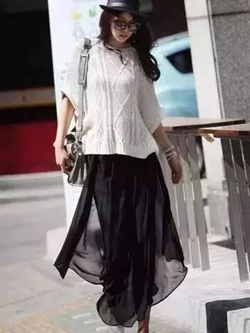 黑纱长裙是既宽松舒适又显瘦的利器。用宽松白色针织衫搭配黑纱裙,不懂色彩搭配没关系呀,黑吧搭配永远不会出错。