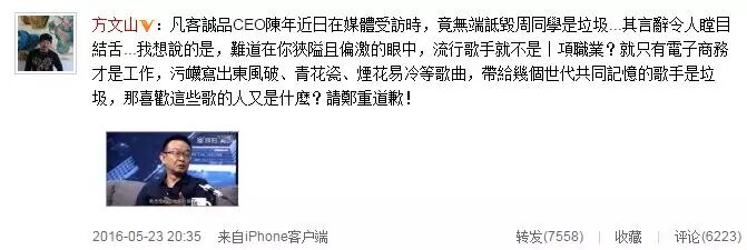 5月23日,方文山针对陈年的言论,在微博留言称:“陈年近日在媒体受访时,竟无端诋毁周同学是垃圾。其言辞令人瞠目结舌。我想说的是,难道在你狭隘且偏激的眼中,流行歌手就不是一项职业?就只有电子商务才是工作,污蔑写出东风破、青花瓷、烟花易冷等歌曲,带给几个世代共同记忆的歌手是垃圾,那喜欢这些歌的人又是什么?请郑重道歉!”