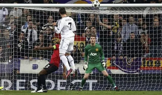 相比于老对手梅西天生的极致球感,C罗展现出来的是一种身体的暴力美学,对每一块肌肉的最大化利用。头槌破门对于C罗来说一直是拿手好戏,2013年欧冠八分之一决赛首回合,他代表皇马在对阵老东家曼联的比赛中上演了一次空中悬停,这是一种比空霸克洛泽还要夸张的空中轰炸——他跳起来头球破门的一瞬间,防守他的埃弗拉的脸部处于C罗的膝盖下面,这更像勒布朗·詹姆斯在NBA总决赛的极致暴扣。