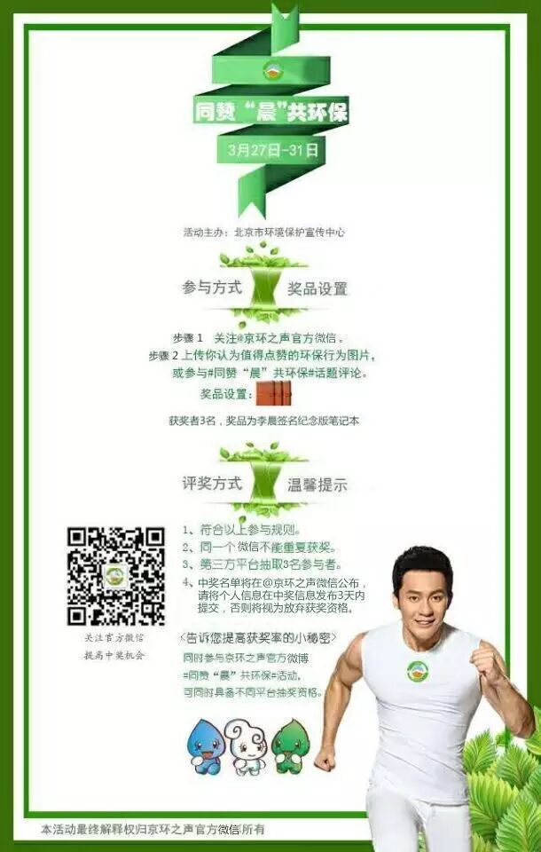 同赞“晨”共环保丨“跑男”李晨签名纪念版笔记本邀您来拿 内地男星 2016-03-27 21:22:01 140 创作不易,用心坚持,欢迎请BaGua喝几杯爱心咖啡!打赏并支持本文 打赏并删除本文 跑男兄弟的“大黑牛”今天做了什么?今天他还是跑男吗?不,今天起,李晨成为北京环保公益大使啦!!! 和北京环保公益大使李晨一起加入环保,为“晨”点赞,也为关心环保的你点赞!上传你认为值得点赞的环保行为图片,或亮一亮你的环保宣言,即有机会赢取李晨签名礼品! 李晨签名纪念版笔记本~想要吗?你想要吗?你真想要吗?快来参加“同赞‘晨’共环保”活动,获取奖品吧。拉仇恨~小编和男神来了一次亲密接触哦O(∩_∩)O哈哈~ 点击“阅读原文”参与答题↓↓↓ 创作不易,用心坚持,欢迎请BaGua喝几杯爱心咖啡!打赏并支持本文 打赏并删除本文 感谢您的支持鼓励,我会继续努力的!文章地址:用户邮箱:打赏金额:USDT 请输入数字点击”去打赏“,即可进行打赏支持本文章哦 李晨 发表评论