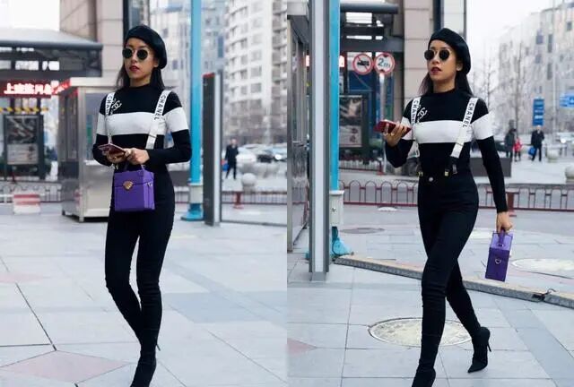 吉克隽逸很喜欢用深色奠定穿搭的基调,一件黑白色接拼的修身内搭,本来是一件百搭的基础款,但是在肩膀处的两个印有字母的肩带却增加了设计感,将视线重点提高,也提高了身材的修长。深紫色的小方包也很有个性,为整体增加了色彩的动感
