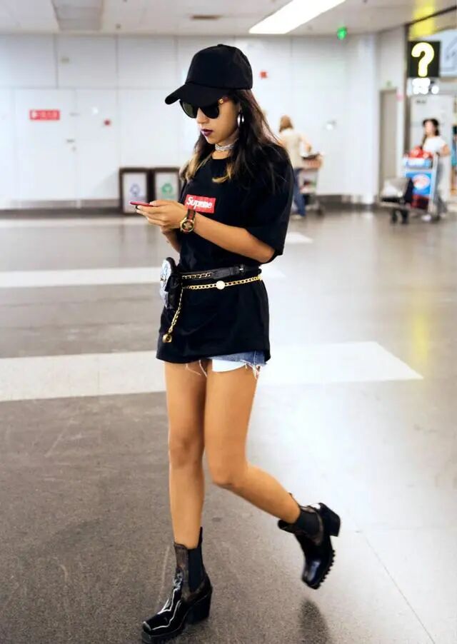 这次的穿搭同样是深色为基调,一套黑色的造型,下边选择了"下身失踪"的穿搭方式,增加了造型的个性感。腰间的皮带将腰线提高,拉长了腿部线条。下摆露出了一些牛仔裤的边边,增加了色彩的活泼,也更加有层次感。超短裤的穿搭露出双腿,仙女们不得不羡慕吉克隽逸的腿型真的太好看了。