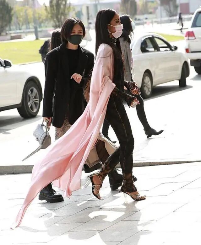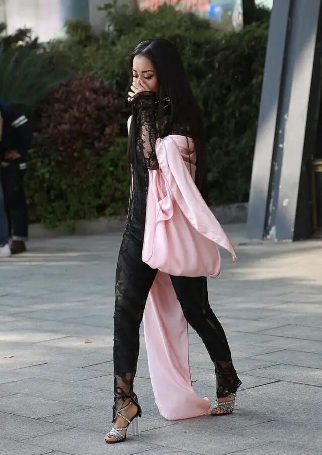 一身黑色的蕾丝连体衣,外边是一件粉色的宽松外套,看起来像是直接披了件"床单",不仅丝毫不丑,竟意外时尚,粉色披风随风飘逸起来,简直气场十足,配合自信的台风,时尚diva简直非她莫属!