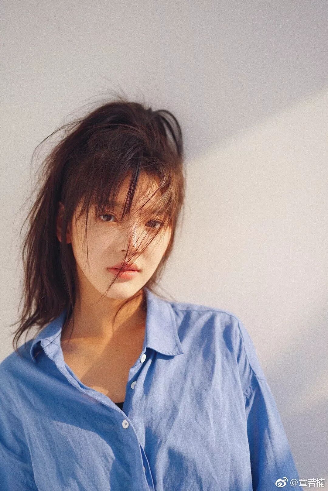 一件蓝衬衫 和松散扎起的马尾