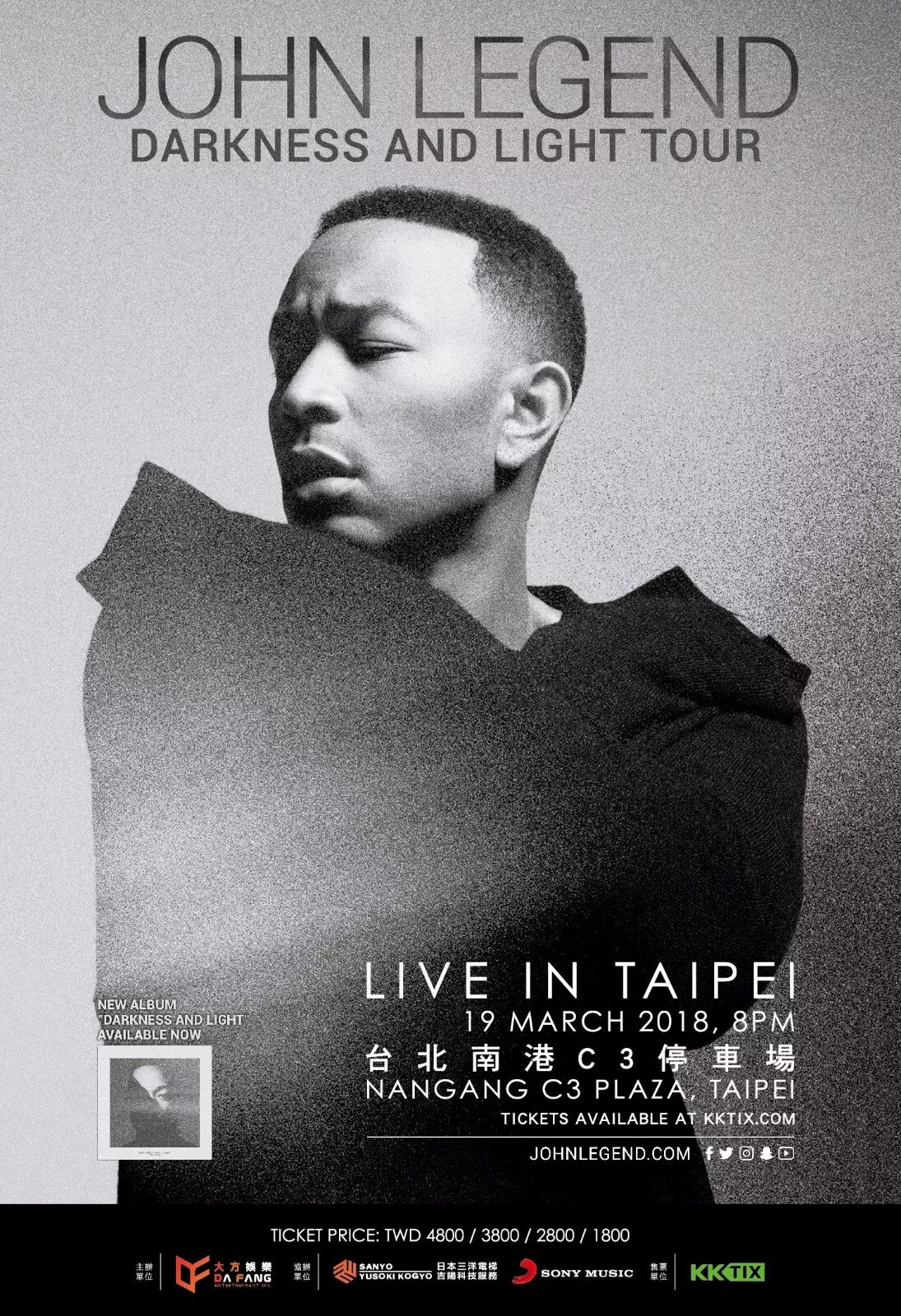 2018年3月19日,约翰传奇(John Legend)将于台北南港C3 中信金融园区停车场举行出道以来首次在台湾的演出,演唱会规划全坐席,让期待已久的粉丝当晚徜徉在约翰传奇的歌声与舞台魅力之中。
