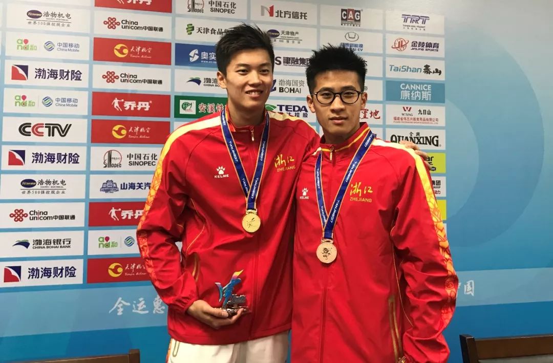 ▲去年全运会汪顺(左)和钱智勇携手登上领奖台