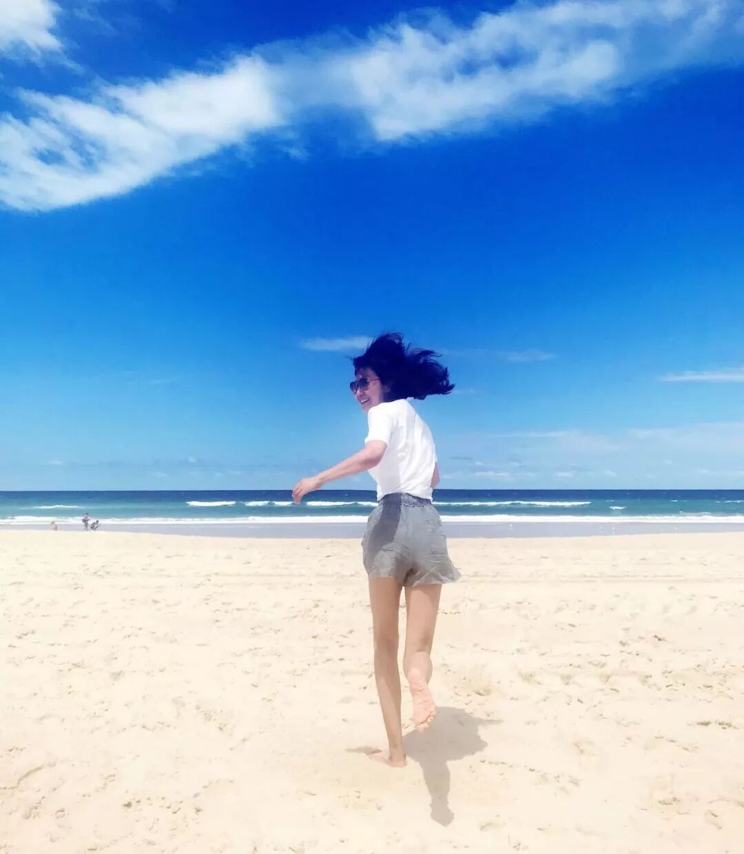 换上极简的 T 恤和短裤,神似 20岁出头的少女。