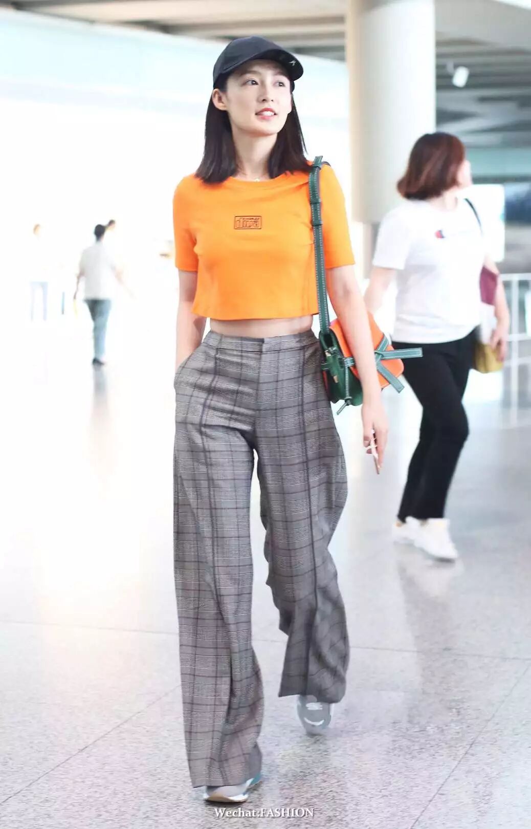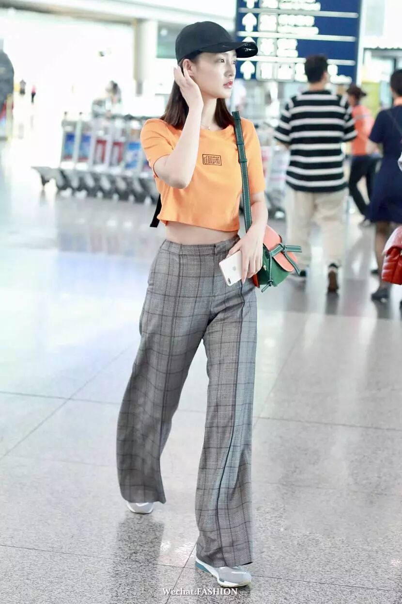 李沁北京机场街拍,身着Ground Zero橘色露腹T恤搭格纹阔腿裤,肩背罗意威 (Loewe) 拼色单肩包,腿长2米。