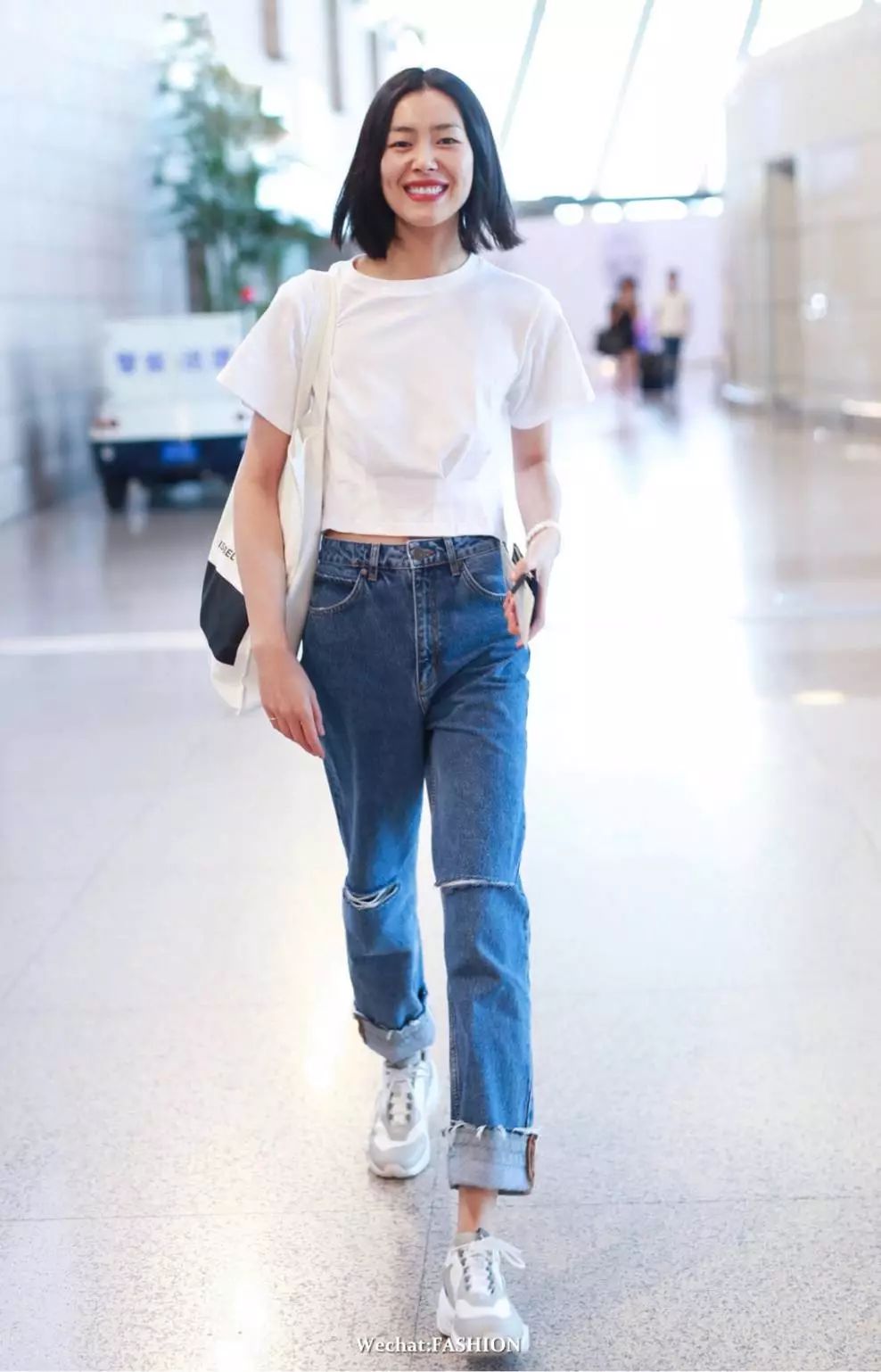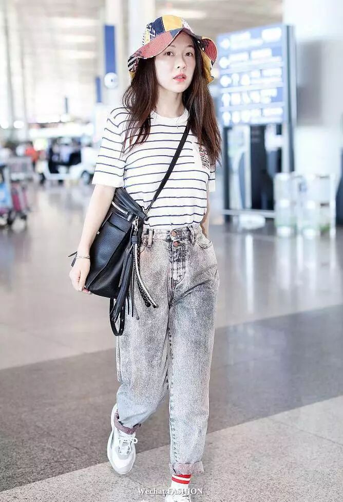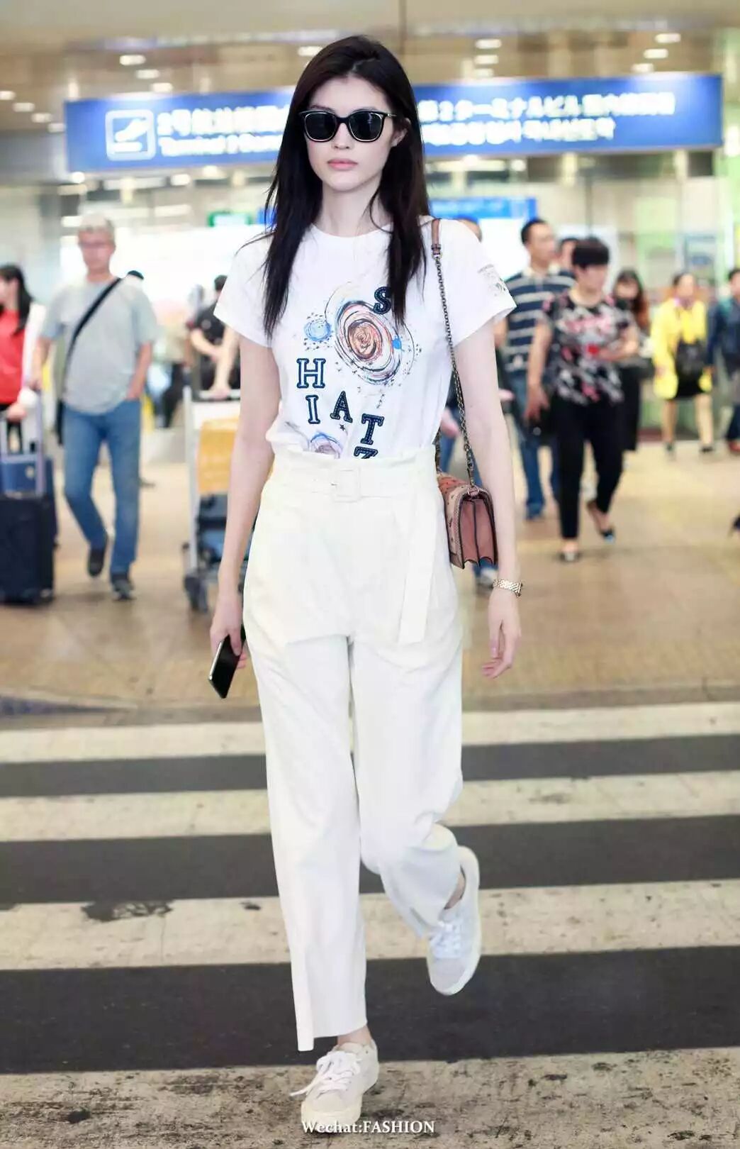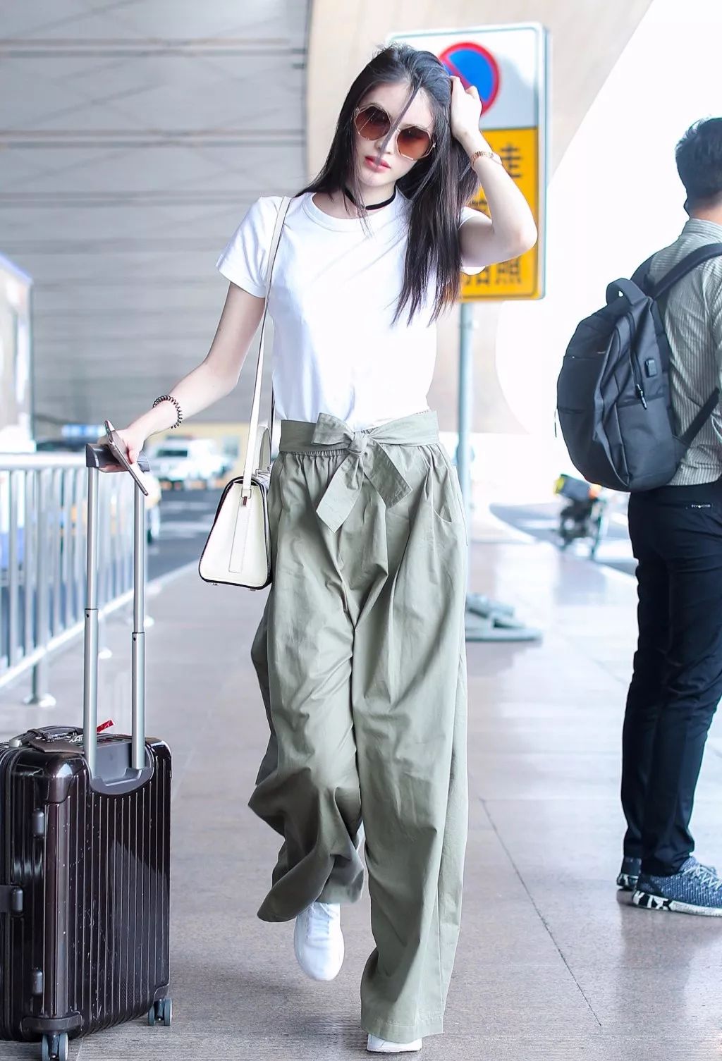 何穗北京机场街拍,基础款的白T恤搭高腰系带纸袋阔腿裤,仙姑的街拍绝对是是我每次必不能错过的。