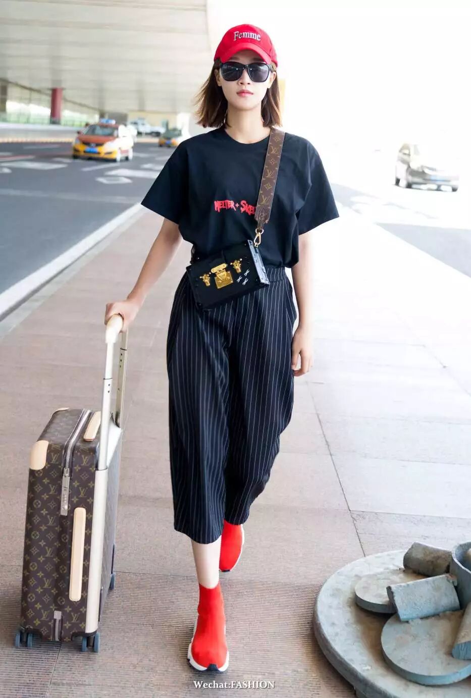蓝盈莹机场街拍,身穿IRO黑色T恤和阔腿条纹七分裤,搭配红色棒球帽和袜子鞋,休闲又亮眼,LV拉杆箱和斜挎包演绎夏天出行活力风。