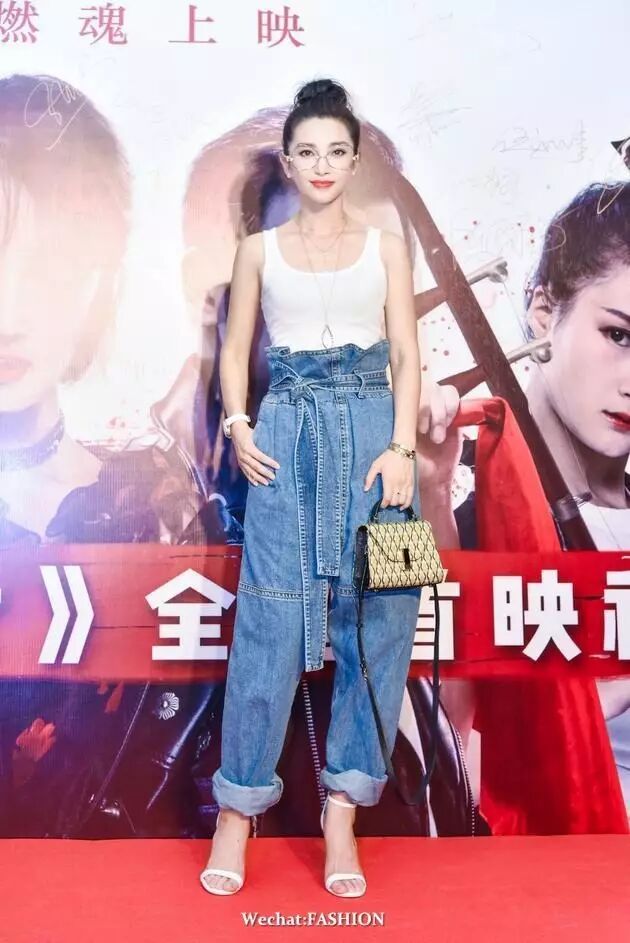 李冰冰身穿Marni蓝色高腰纸袋牛仔裤搭配白色背心清爽亮相,造型干练利落,一颗可爱的丸子头很配上红唇,非常的有诱惑力。