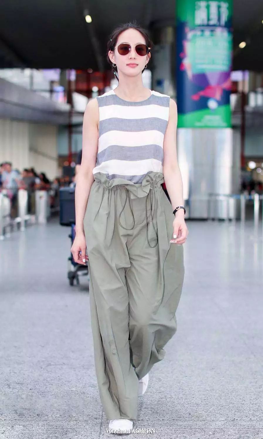 张钧甯北京机场街拍,条纹背心搭橄榄绿高腰纸袋阔腿裤,皮肤真好呀。