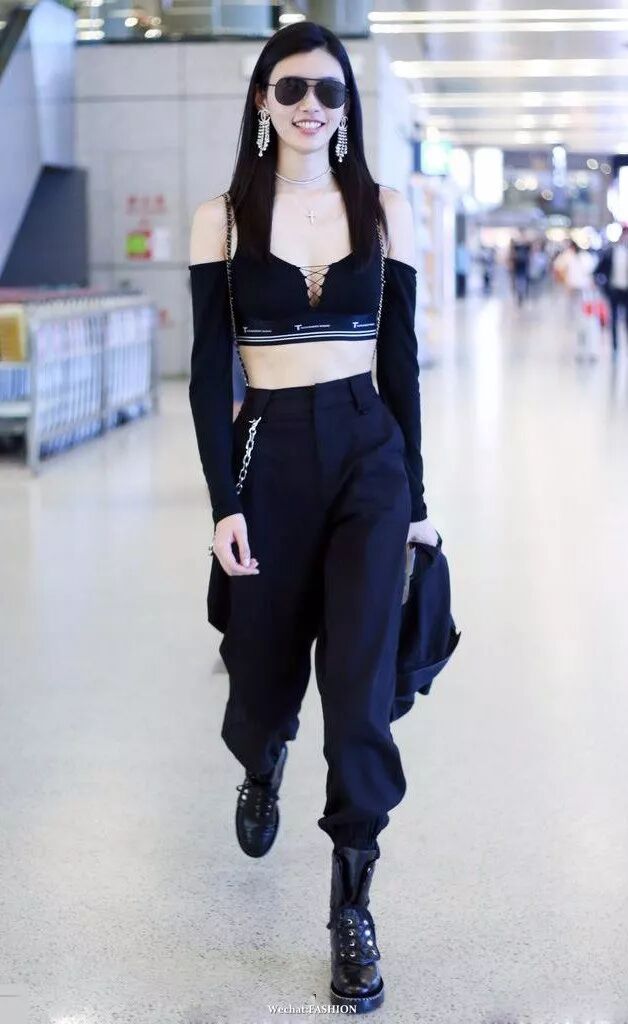 奚梦瑶这套look很美了,绑带露腹上衣出自王大仁的副线品牌T by Alexander Wang,搭配I.AM.GIA黑色工装裤性感不失率性,Chanel的耳饰点缀精致个性。运动风的性感真是帅气又可爱。搭配运动裤和马丁靴,美颜女特工上线!