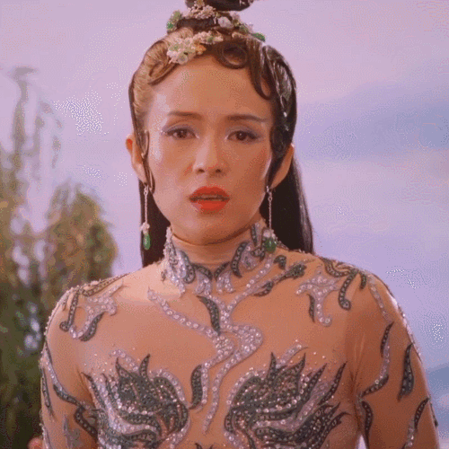 章子怡长相锐利,气质清刚,因此总显得很挣命。野心写在脸上,眉目间满是倨傲的自信。