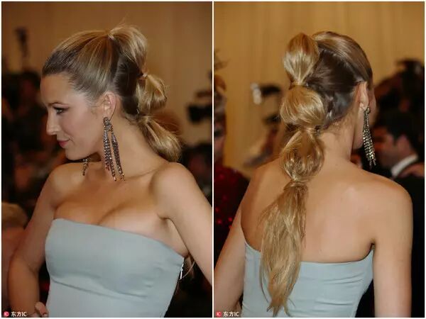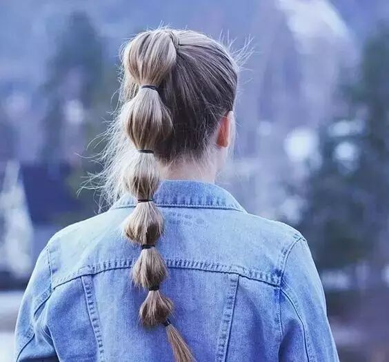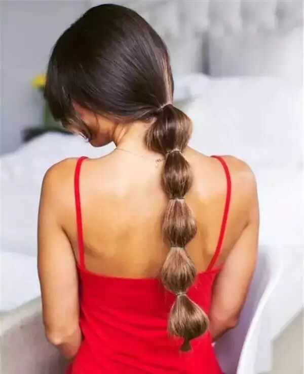 首先,扎一个马尾,马尾的高低看自己喜欢,高的梳出来会比较活泼可爱,低一点的也很优雅;然后,隔几厘米用一个皮筋绑上,形成一个椭圆状的葡萄形状, 直至发尾,就OK啦~