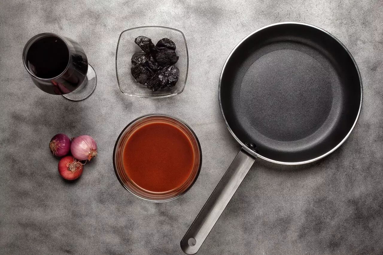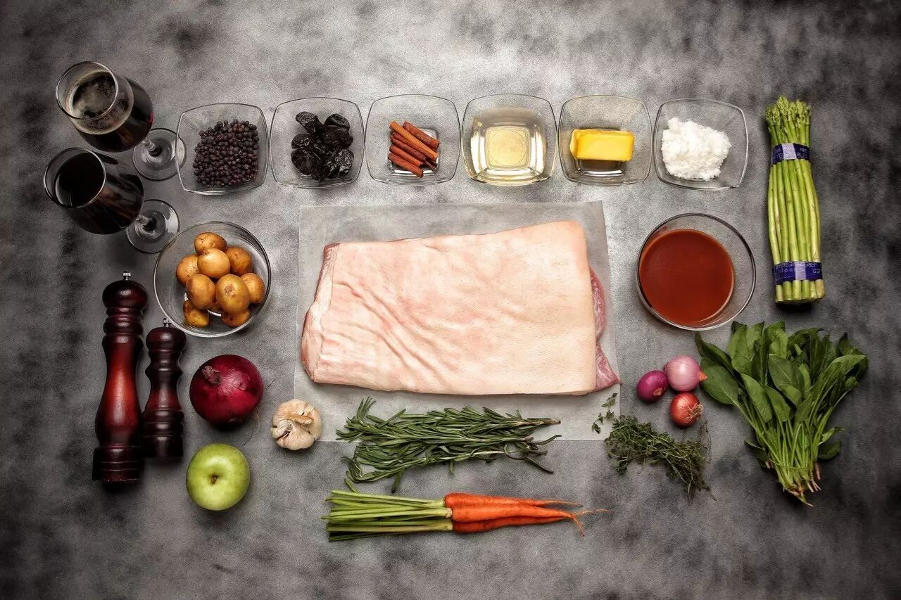 另取一锅,放入3个小洋葱翻炒,倒入250ml红酒,等酒精挥发后过滤掉洋葱,并转换到一个平底锅中收汁,倒入500ml烧汁放入10g西梅块熬煮;把烤好的五花肉取出,剪断绳子并切开摆盘,放入配菜和熬好的酱汁,完成。