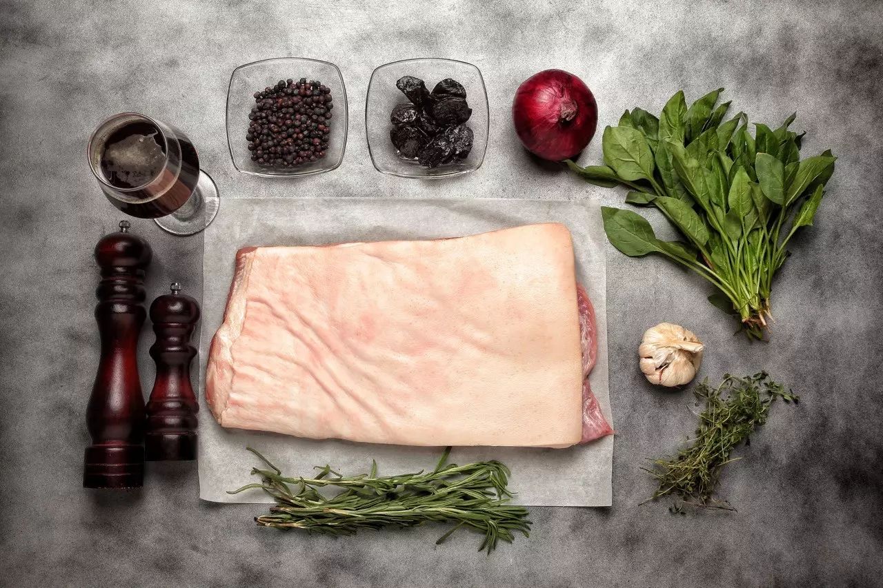 将1000g带皮五花肉用750ml德国黑啤浸泡,并放入10颗杜松子果和1个切丝洋葱泡半小时;150g菠菜去根焯水,再放入凉水中,用手捞起挤干水分切成碎末备用;在浸泡好的五花肉上划几刀,撒上5g迷迭香、5g百里香的叶子,放入3瓣蒜片、5g海盐、5g黑胡椒末和150g切好的菠菜;