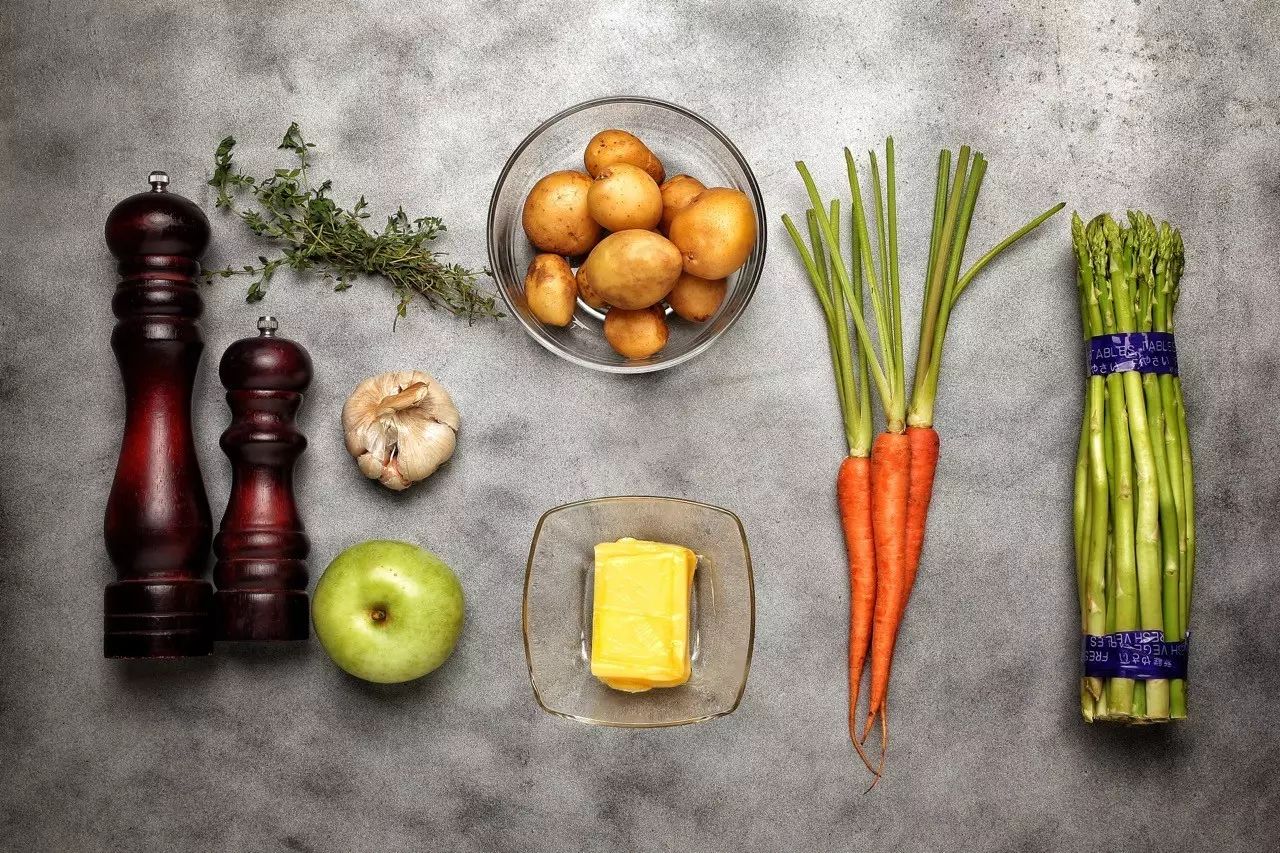 把150g小土豆一分二,3个苹果带皮切块备用;100g芦笋和100g小胡萝卜焯水备用;融化20g黄油,放入芦笋和小胡萝卜,再放入苹果,撒上3g盐和3g黑胡椒粉,翻炒后盛出备用;焯水后的土豆用20g黄油炒至金黄,放2瓣蒜、2g百里香,翻炒盛出备用。