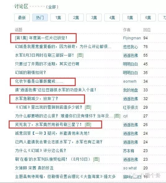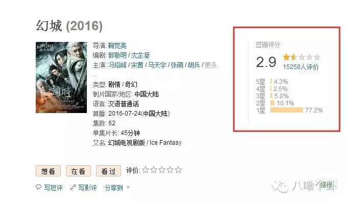 《幻城》为什么扑街呢?这是个值得影视圈大力思考的问题,卡斯不够?话题不够?其实并不是!剧情和特效,以及对芒果台播烂剧的抵触情绪占领了主要口碑,人固有的习惯和思维是特别可怕的,想改变特别难,也有跟风刷差评的,剧都没看就凑热闹的,也占一大部分!这种情况深究到底还是中国人从古往今就一直根深蒂固的凑热闹,爱看热闹的中华民族传统美德,管你三七二十一先围观再说,反正我站着说话不腰疼,你说好,我也说好,你说不好, 我也说不好!中国人最缺少的是主见,是自己的独立的思维,思考,慎重的考量,跟风是最容易,也最无知的行为!
