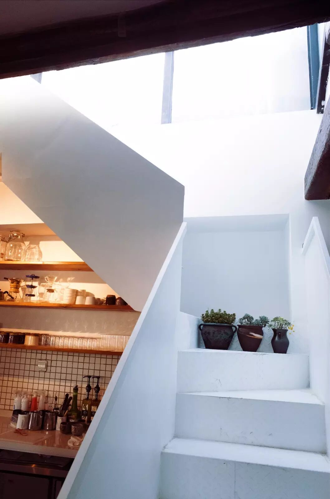 ▲ 设计师 Luffy:楼梯转折通向二楼的阳台,即是必要的通道,但不像让它成为单纯的功能存在,由于二楼有非常好的采光,所以这里采用了纯白的色调,扩大的自然光源,让所有的线条都来自于光和影的组合。