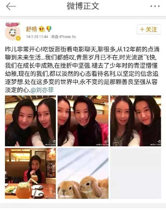 刘亦菲也曾公开表示过,舒畅是她圈中最好的女朋友。传言刘亦菲的妈妈特别喜欢舒畅,只要给刘亦菲买衣服必定会给舒畅也备一份,感慨一句,舒畅以前真是好看。