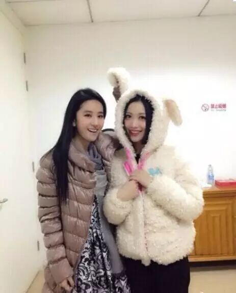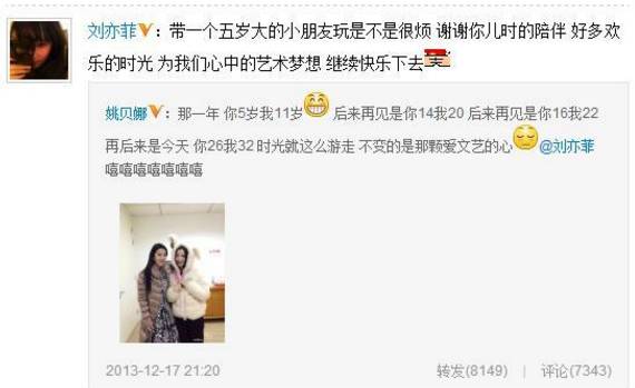 2013年12月17日21点20分,姚贝娜通过微博晒出一张和刘亦菲的合影。