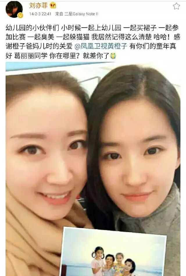 去年2月,刘亦菲还在微博发了一张与黄橙子的合照,“幼儿园的小伙伴们,小时候一起上幼儿园,一起买裙子,一起参加比赛,一起臭美,一起躲猫猫,我居然记得这么清楚,哈哈!感谢橙子爸妈儿时的关爱。”