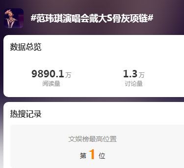 10月28日,有网友称大S的骨灰被做成了七条项链,范玮琪在近日的演唱会上佩戴了其中一条。词条“范玮琪演唱会戴大S骨灰项链”也登上热搜榜。