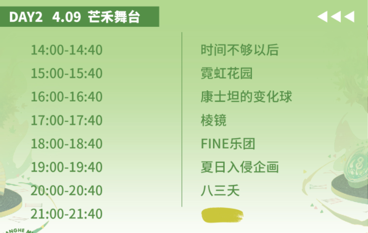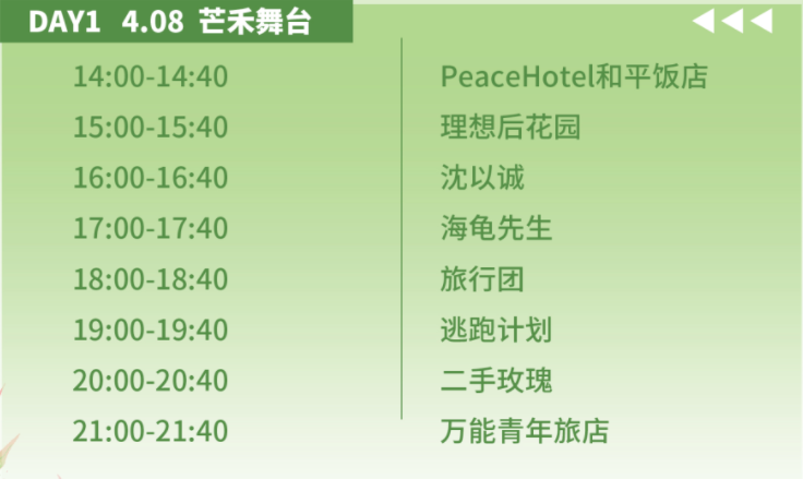 演出阵容:万能青年旅店/二手玫瑰/逃跑计划/旅行团/海龟先生/八三夭/夏日入侵企画/棱镜/霓虹花园NeonGarden/沈以诚/理想后花园/康士坦的变化球/FINE乐团/时间不够以后/ PeaceHotel和平饭店