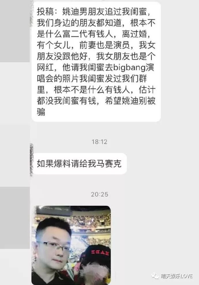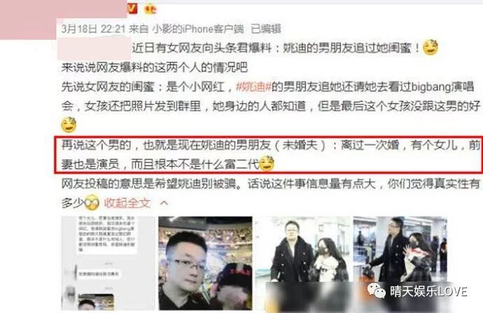 随后,在2018年3月份的时候有人投稿爆料称姚笛的这位男友追过别人闺蜜,称他离过一次婚还有个女儿,前妻也是演员,还根本不是什么“富二代”有钱人。