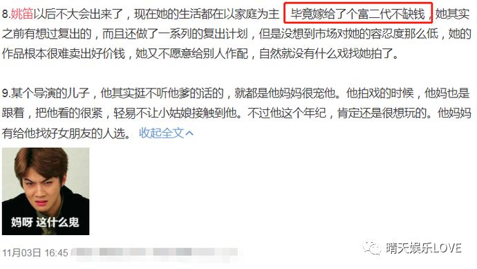 而针对姚笛已经结婚,在这之前有不少人已爆出,但是没上述知情人爆料的详细罢了,早先有人称姚笛已经嫁给了富二代不缺钱。