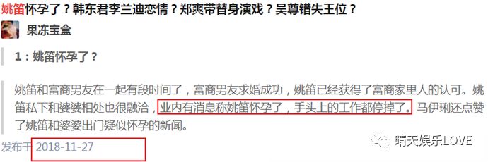 与此同时,在2018年11月份的时候,有人爆料姚笛“怀孕”,具体表述是“业内有消息称姚笛怀孕了”因此“手头上的工作都停掉了……”