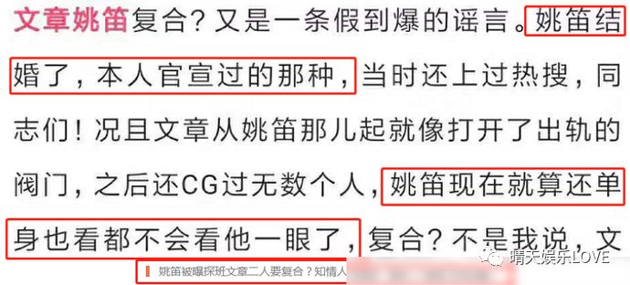 随后,还有娱记爆料姚笛和文章复合是假的,并且言之凿凿的称姚笛已经“结婚”就算现在单身也都不会再看文章一眼!