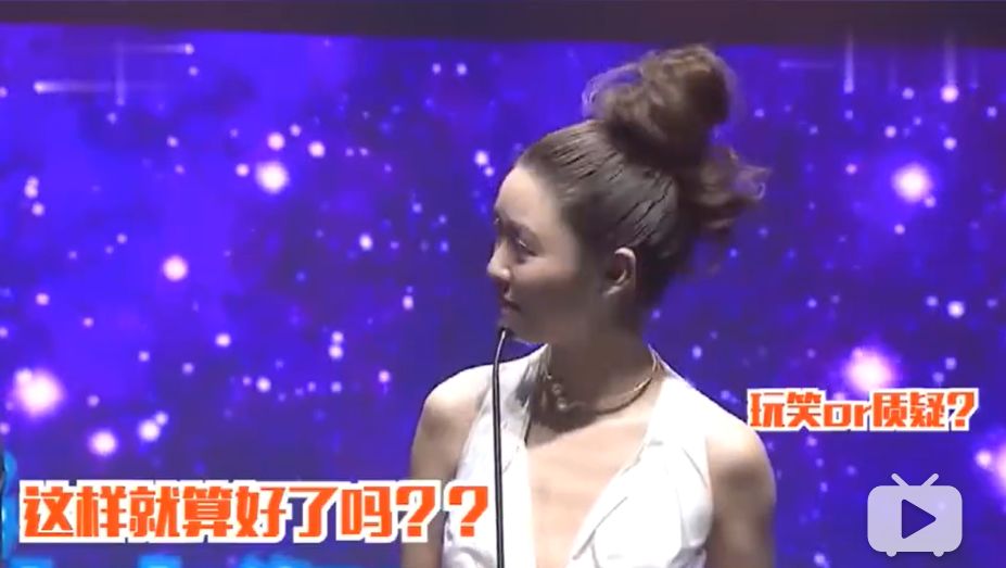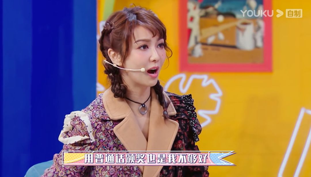 “那个梗(原本)是夸她,因为《四大名捕》就是用黑布盖住她的脸,整个戏只用眼神,但是我普通话不好,那个梗我忘了,意思是说她不露脸,只用眼神,没有脸,(演技)也好,也是可以得奖,就是夸她的眼神。”