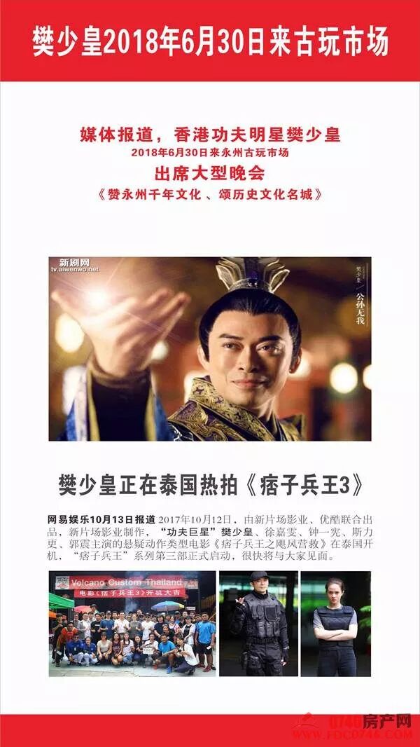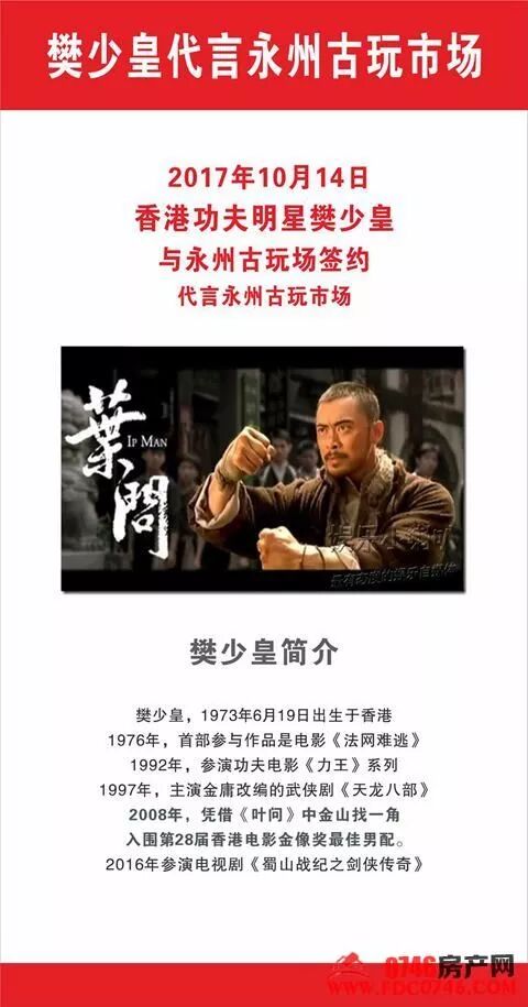 0746房产网讯:今年十月,永州楼市刚刚发生一件大喜事:著名香港功夫明星樊少皇签约代言永州古玩市场。刚进入十一月,今天(11月8日)就明确宣布2018年6月30日来永州古玩市场与永州市民见面,助阵永州古玩市场大型晚会。